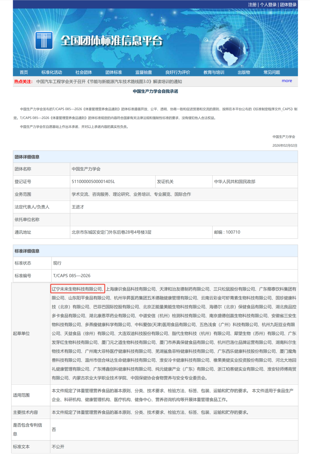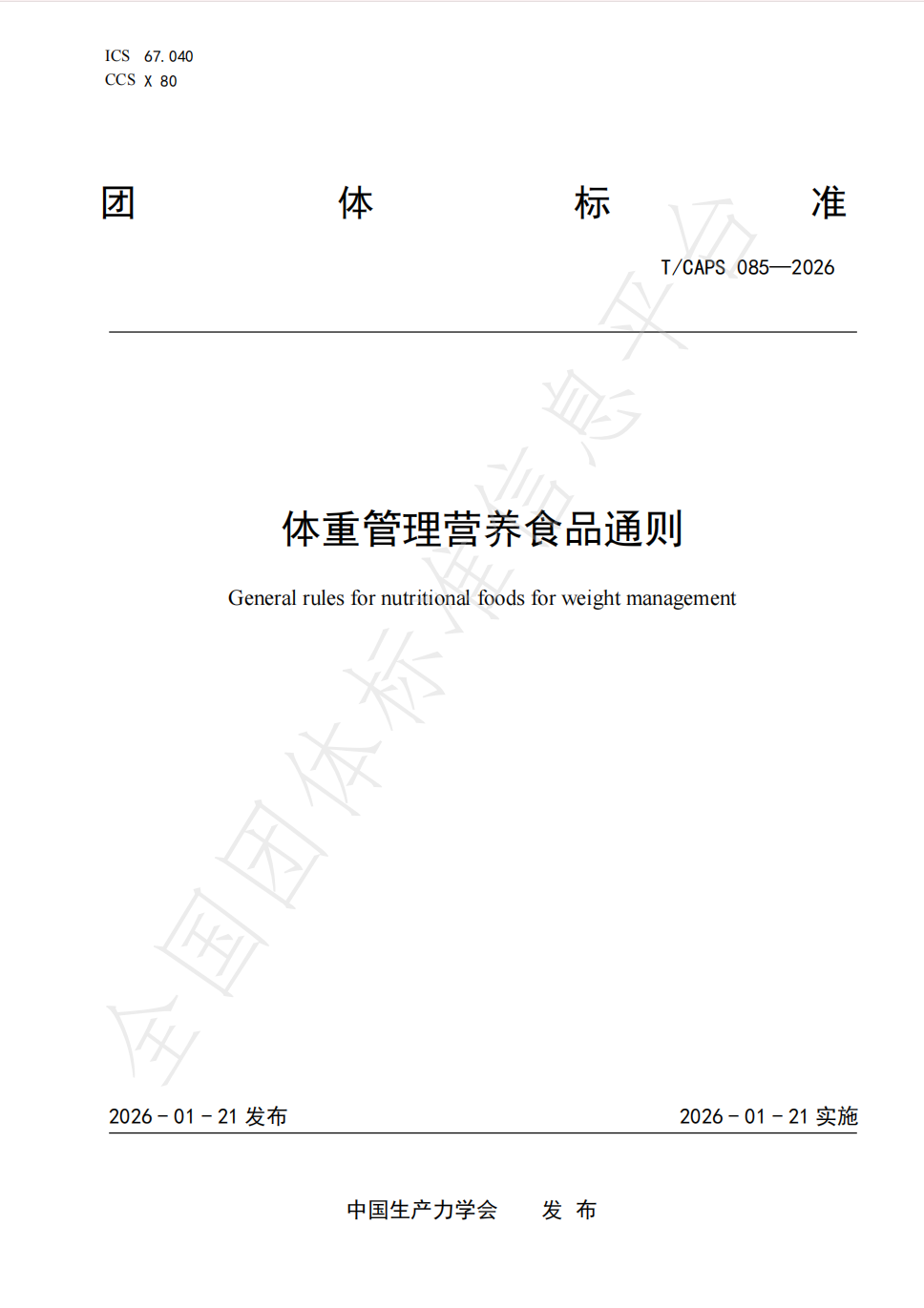 为此,由辽宁未来生物科技有限公司牵头,联合国内近50家知名企业、科研机构和行业协会,共同起草制定的《体重管理营养食品通则》(T/CAPS 085—2026)团体标准,已于近日正式发布实施!