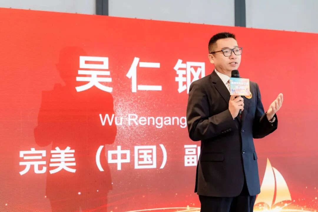 完美公司副总裁兼业务市场中心总经理吴仁钢作开场寄语。他点明了在AI时代背景下以人为核心展业的重要性和稳定性,引发对行业本质的思考。他还提出一个有价值的公式:“感知价值=产品力×影响力(表达力)”,清晰阐述了产品力、表达力与感知价值之间的关系,并鼓励学员们“把表达力练得更好,影响更多的人,将自己内在真正的价值展现出来”。
