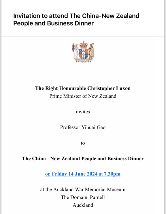 新西兰总理拉克森向高益槐教授、高炜总裁亲自发出邀请函