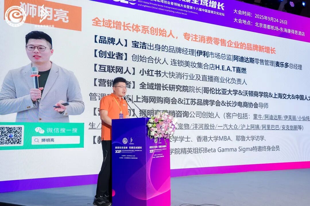2025年9月25日上午,北京东海康德思酒店内气氛热烈,“2025年全球私域创业者领袖大会暨第十八届中国直销文化论坛”进入第二个主题演讲环节。继秦永楠教授关于社交资本的深度分享后,全域增长体系创始人、前小红书大快消行业及直播商业化负责人狮明亮先生登台演讲,为与会者带来题为《全域营销增长体系构建——穿越企业生命周期与经济新常态之策》的精彩分享。