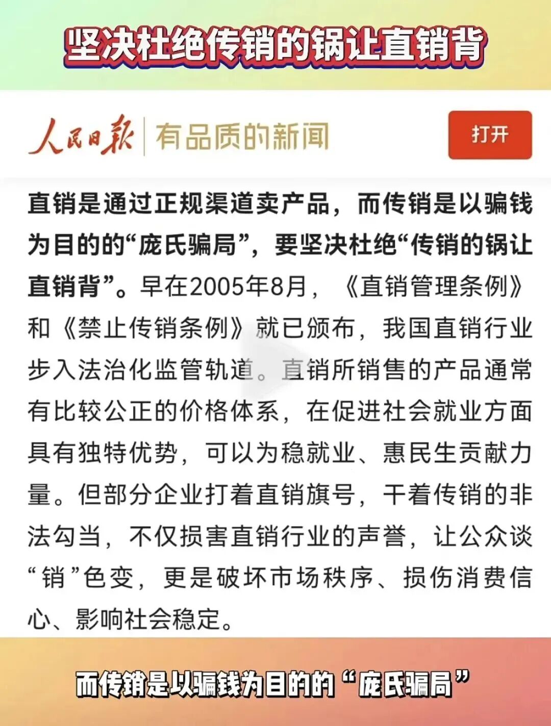 近日,《人民日报》刊发题为“坚决杜绝传销的锅让直销背”的评论文章,深刻剖析了社会舆论与市场监管中长期以来存在的混淆现象。将传销的非法恶名简单套用于合法直销行业,