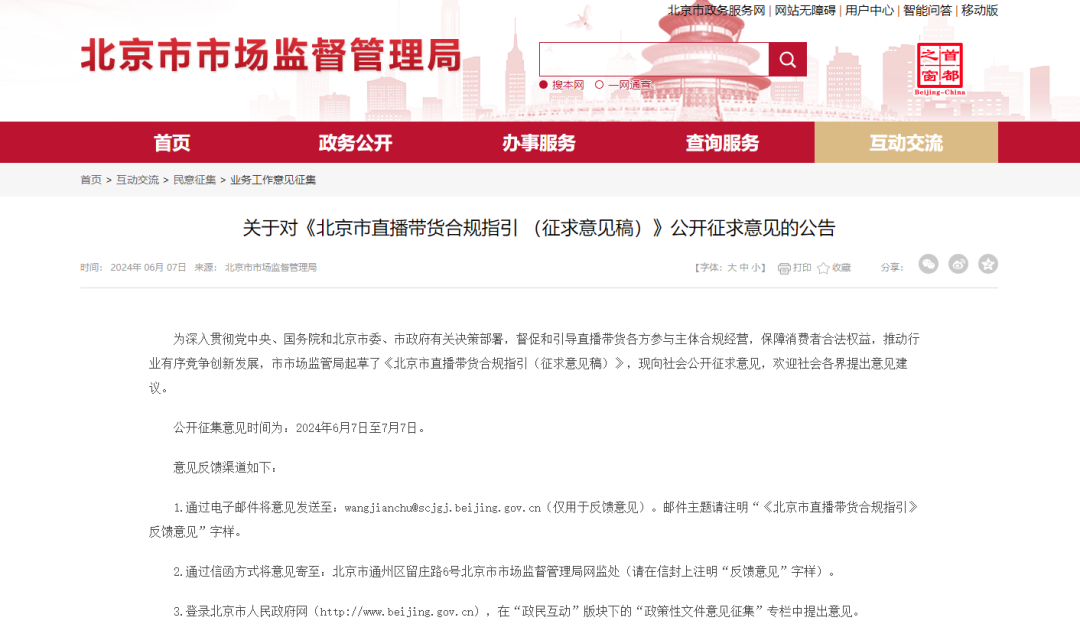 近日,北京市市场监督管理局发布《北京市直播带货合规指引(征求意见稿)》,对直播带货平台管理责任不到位、商业营销行为不规范等问题进行制约和管理。《征求意见稿》提出