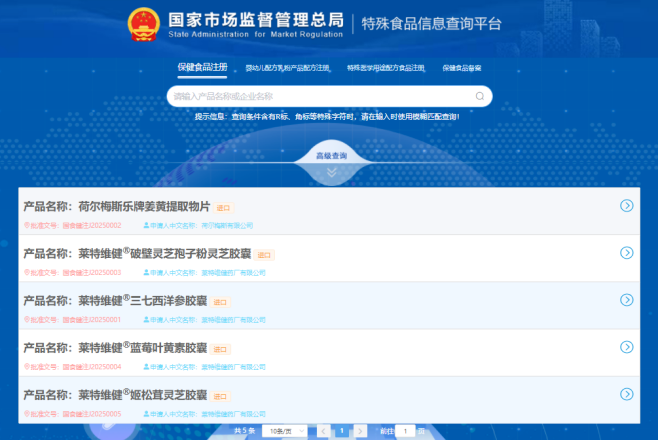 近日,在国家市场监督管理总局特殊食品信息查询平台中搜索发现,共有5款进口保健食品分别在2025年5月、6月和7月获得了注册批件,2018年以来进口保健食品注册持