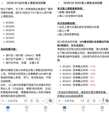 一位邮轮代理最近给我发来皇家加勒比游轮的“2026Q1海上课堂活动招募”,邮件内容显示,今年2月伊始,海洋光谱号一口气安排了六个针对同业的免费航次,邀请旅行社、邮轮代理上船。