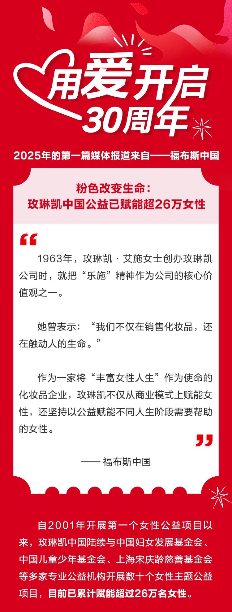 1963年,玫琳凯·艾施女士创办玫琳凯公司时,就把“乐施”作为公司的核心价值观之一。她曾表示:“我们不仅在销售化妆品,还在触动人的生命。”作为一家将“丰富女性人生”作为使命的化妆品企业,玫琳凯不仅从商业模式上赋能女性,还坚持以公益赋能不同人生阶段需要帮助的女性。 玫琳凯进入中国市场不久,便积极开展女性公益赋能项目。2001年,玫琳凯就和中国妇女发展基金会合作设立“玫琳凯女性创业公益项目”,通过提供小额无息循环贷款,帮助女性成功自立创业,实现经济赋能。截至目前,全国已有20多个省份8万多名女性因玫琳凯女性创业基金实现了创业的梦想。 自2001 年开展第一个女性公益项目以来,玫琳凯中国陆续与中国妇女发展基金会、 中国儿童少年基金会、上海宋庆龄慈善基金会等多家专业公益机构开展涉及健康、教育、创业等多领域数十个女性主题公益项目,目前已累计赋能超过26万名女性。 01 为幼小的她 每个孩子都值得拥有美丽的微笑 自2014年起,玫琳凯感恩公益项目共拨款510万元支持“微笑1000”项目,完成了1,009例唇腭裂女童修复手术的捐赠。在该项目中,玫琳凯中国美容顾问和员工,不仅参与了款项捐助,还积极报名“微笑1000”非医疗志愿者,为唇腭裂患儿及其家庭带去了暖心的鼓励和支持。 02 为成长的她 从“春蕾计划”到“捡回珍珠”,支持她们的学业与梦想 早在2002年,玫琳凯就与全国妇联以及中国儿童少年基金会合作开展“春蕾计划”,在全国兴建13所玫琳凯春蕾小学,帮助了约12,000名失学女童。 2022年,玫琳凯又携手浙江省新华爱心教育基金会开展“捡回珍珠计划”,帮助家庭相对贫困的高中女生完成学业。2024年9月,第三个“玫琳凯珍珠班”开班。玫琳凯珍珠班里的“珍珠生”将被免除在校三年的学费及住宿费,并获得由玫琳凯资助的三年每位7,500元的生活补助款,安心地度过三年高中时光。包含今年新增的42名珍珠女生在内,玫琳凯已累计帮助93名高中女生。“捡回珍珠”项目中也不乏玫琳凯美容顾问的支持,美容顾问通过参与美丽课挑战,获得公益结对名额。 2024年9月,玫琳凯中国还与美容顾问一起启动了全新“365公益助力计划”,美容顾问通过一堂堂美丽课行动,让爱发生在每天每“课”,支持包括“捡回珍珠计划”在内的更多公益项目。该计划目前已经吸引超过1.6万名美容顾问参与。 03 为迷茫的她 赋能女大学生职业发展,自信迎向未来 面对当代大学生普遍存在的职业迷茫现象,玫琳凯中国于2023年启动了“你好,未来!”女大学生职业赋能项目。2024年,玫琳凯中国与海鸥计划共同发起暑期实践项目,深度开展校企合作,助力女大学生实习,支持职业规划发展,让女大学生们在走出校园前做好步入职场的基础准备。2年来,活动已惠及数百位中国女大学生。 在该项目中,玫琳凯爱心美容顾问为女大学生免费提供“职业礼仪与形象课”,玫琳凯员工作为导师指导女大学生实习成长,让她们在“象牙塔”时期便对未来职场有所准备,更加自信地迎接未来职场挑战! 04 为妈妈们 “加油!妈妈”,赋能全职妈妈幸福力 2023年,玫琳凯与中国妇女发展基金会共同发起 “加油!妈妈”全职妈妈支持计划,旨在深入了解全职妈妈群体现状,赋能妈妈幸福力。“加油!妈妈”在全国建立了超过20个全职妈妈社群,吸引了近2,000名全职妈妈,并围绕技能学习、兴趣拓展、创业就业扶持、家庭亲子教育等主题开展近100场社群活动,约2,300人次参与。玫琳凯中国爱心美容顾问也为全职妈妈们带来了数十场美丽课,帮助她们变得更加自信美丽。 2024年,玫琳凯与中国妇女发展基金会联合发布了一线城市《全职妈妈群体状况调研报告》,旨在唤起社会对这一群体的关注,认可并赞美她们的付出和价值,以减轻妈妈们的养育焦虑,帮助她们发现自身潜力,提升感受幸福的能力。 05 为创业的她 女性只要拥有机会,就能发挥无限的潜能 除“女性创业公益项目”外, 2023年,玫琳凯中国还与中国妇女发展基金会共同发起“@她创业计划—木兰加速计划”项目。自项目启动以来,通过打造“木兰加速空间”、开展赋能培训、升级优化农产品包装等,激发乡村妇女创业就业新动能,带领乡村妇女驶入增收致富快车道,在乡村振兴中贡献她力量。目前,10个“木兰加速空间”举办培训、交流、分享等活动超过85场,惠及乡村女性超过2,700人次。 在2017年,玫琳凯中国还携手联合国开发计划署、中国妇女发展基金会、中国国际经济技术交流中心,共同启动了外普拉“联合国可持续发展目标示范村项目”。该项目是联合国开发署第一个在中国以妇女扶贫为主的实践可持续发展目标本土化的村级项目,通过试赋能当地女性,为村庄带去了实现了翻天覆地的变化。外普拉项目启动以来,玫琳凯公司累计捐赠600万人民币,用于相关硬件设施完善。 玫琳凯外普拉村项目 玫琳凯一直以来都相信:女性只要拥有机会,就能发挥无限的潜能。 愿予以微光,照亮她们的人生。未来,作为一家将“丰富女性人生”刻在基因里的企业,玫琳凯将继续携手美容顾问和员工们,汇聚更多爱心和力量,共创更多美好的“粉色改变”,用公益赋能“她”幸福。